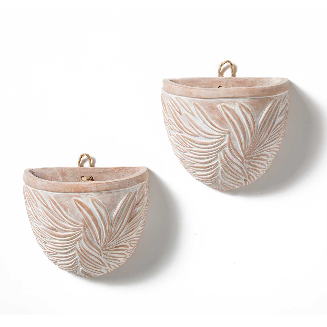 No floor space for a planter? We have you covered ! These wall-mounted planters with a naturally inspired design are just what you need. Each decorative, indoor wall planter is crafted from natural terracotta clay, which is molded, fired, and whitewashed for rustic appeal. These fair trade planters are also easy to mount—simply use the attached, sturdy jute rope hanging loop. Great for succulents, spider plants, herbs and other small plants. No drainage holes. To preserve the beauty and elongate the life of these planters, protect them from rain and excess moisture. Dimensions: 6″h x 7″w. Due to handmade nature, variation may occur.