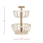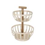 A two-tiered basket is the perfect option to add a touch of modern to your traditional kitchen decor while also providing a practical solution for countertop organization. Thick strips of white metal are securely attached with rivets to create two baskets. The warm tone of the sustainable natural mango wood handle softens the look of the clean white metal. With two different basket sizes, storing fruit, vegetables, or other kitchen items is easy to do while adding a decorative element to your kitchen storage. -The mango wood used is part of a sustainability effort in India. For each tree harvested, at least one is planted in its place.