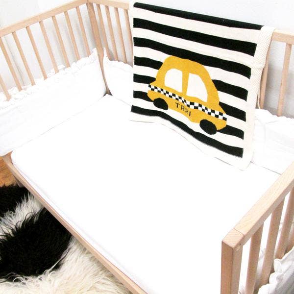 Estella’s popular organic taxi lovey blanket has grown up! This large baby blanket features bold 1.5″ thick stripes, ultra-soft hand-knit organic cotton, and a large taxi design on the front.