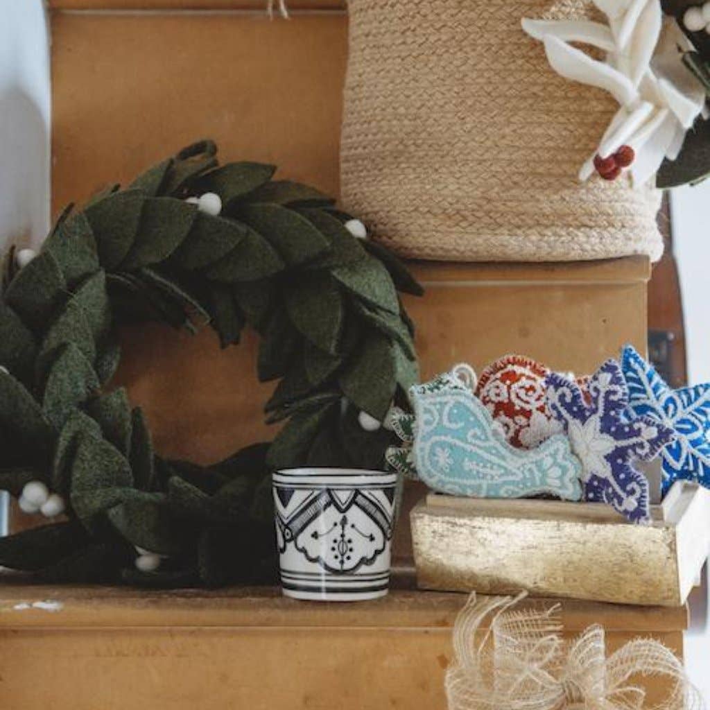 Pucker up for the holidays under our Mistletoe Wreath! Featuring soft forest green leaves and tasteful mistletoe berries, this Felt Wreath is a great piece to add to your handmade holiday collection! Each wreath has a small loop on the back making it easy to hang anywhere in your home.