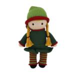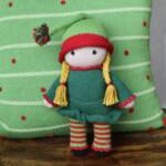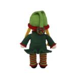 This adorable knit toy is a perfect companion for the holiday season. Dressed in a charming green outfit with red accents, the toy features lovely braided yellow hair tucked under a cozy green hat. The attention to detail in the striped leggings and delicate stitching brings warmth and character to this delightful doll.
