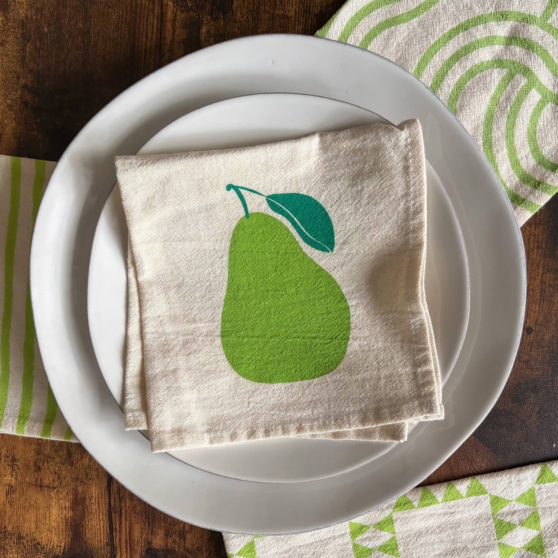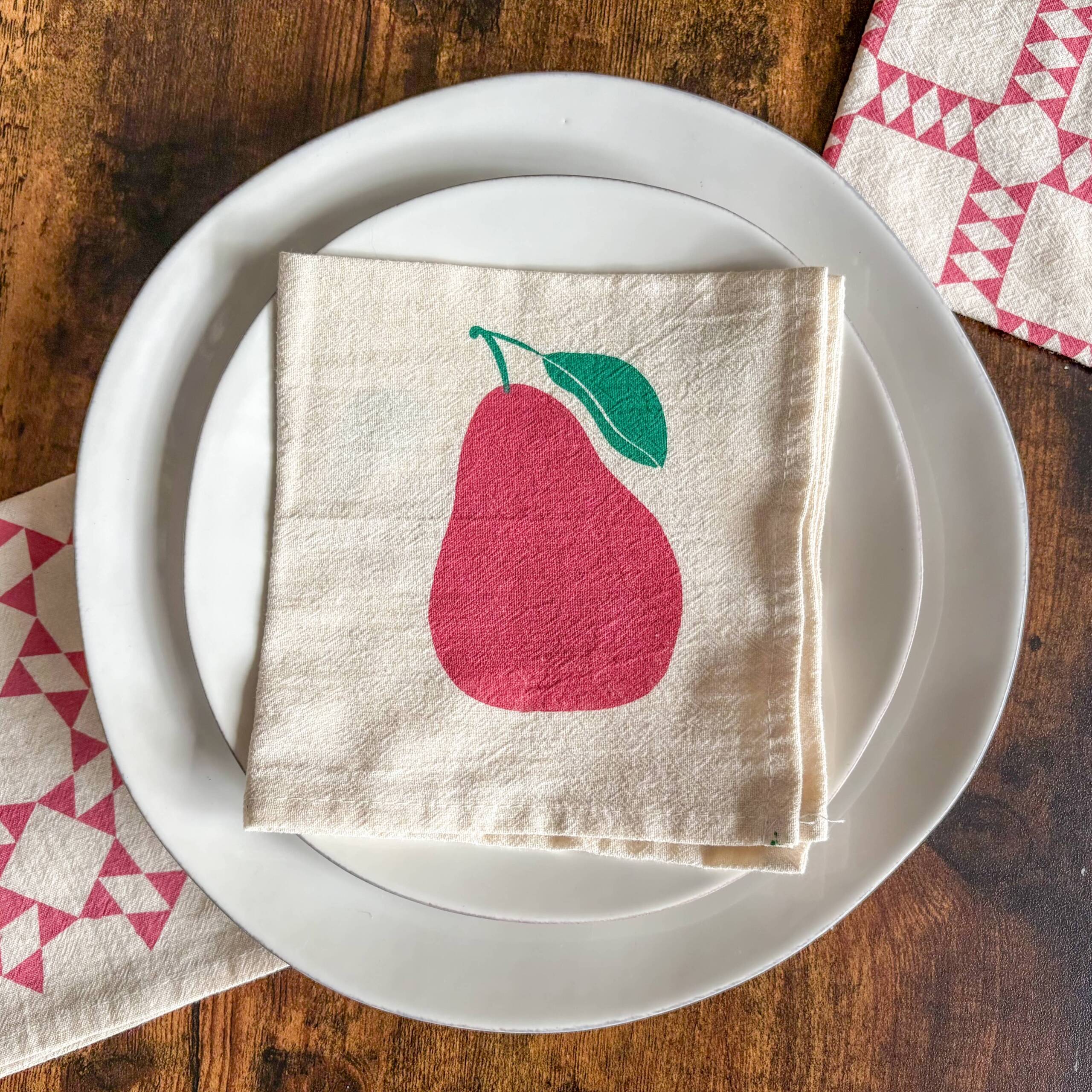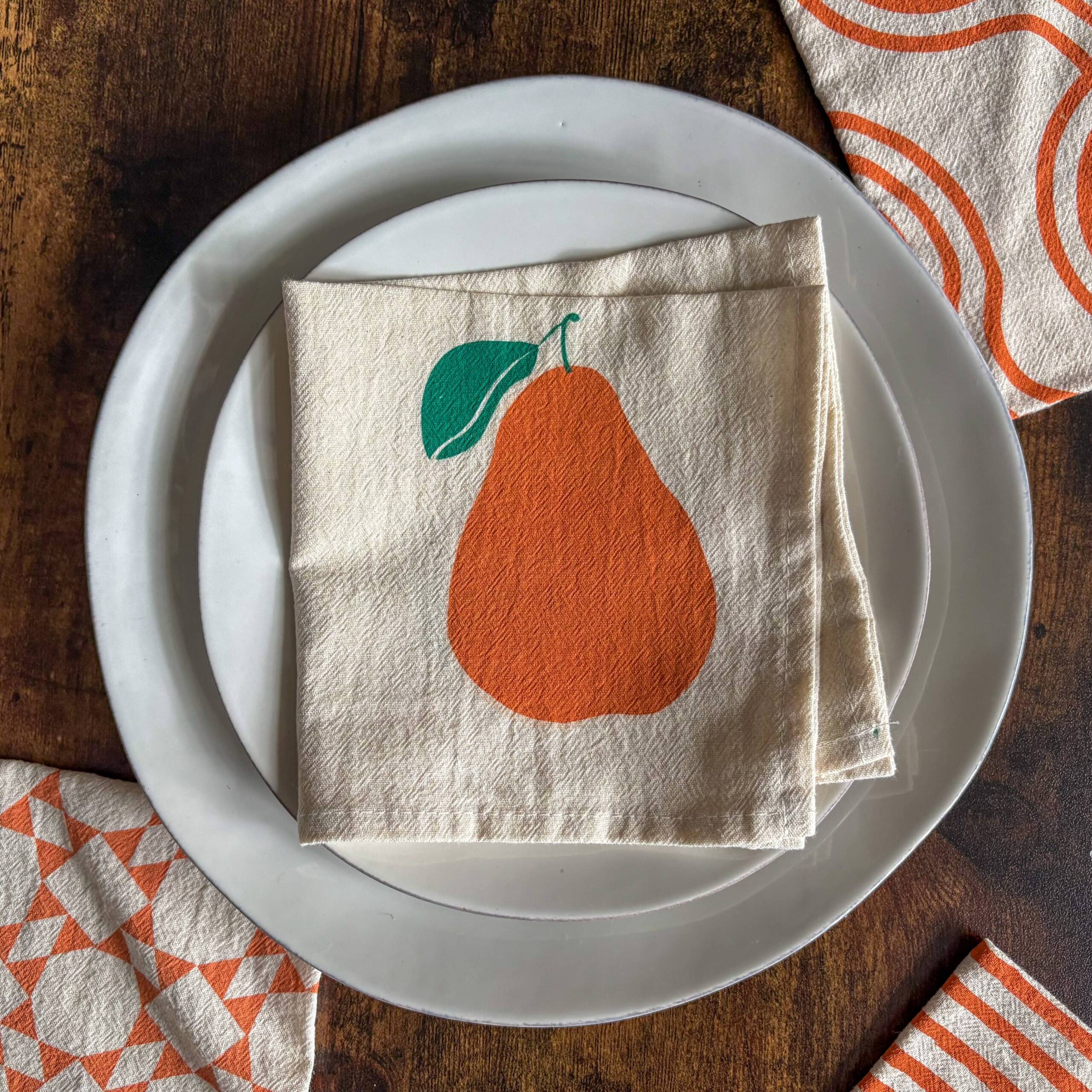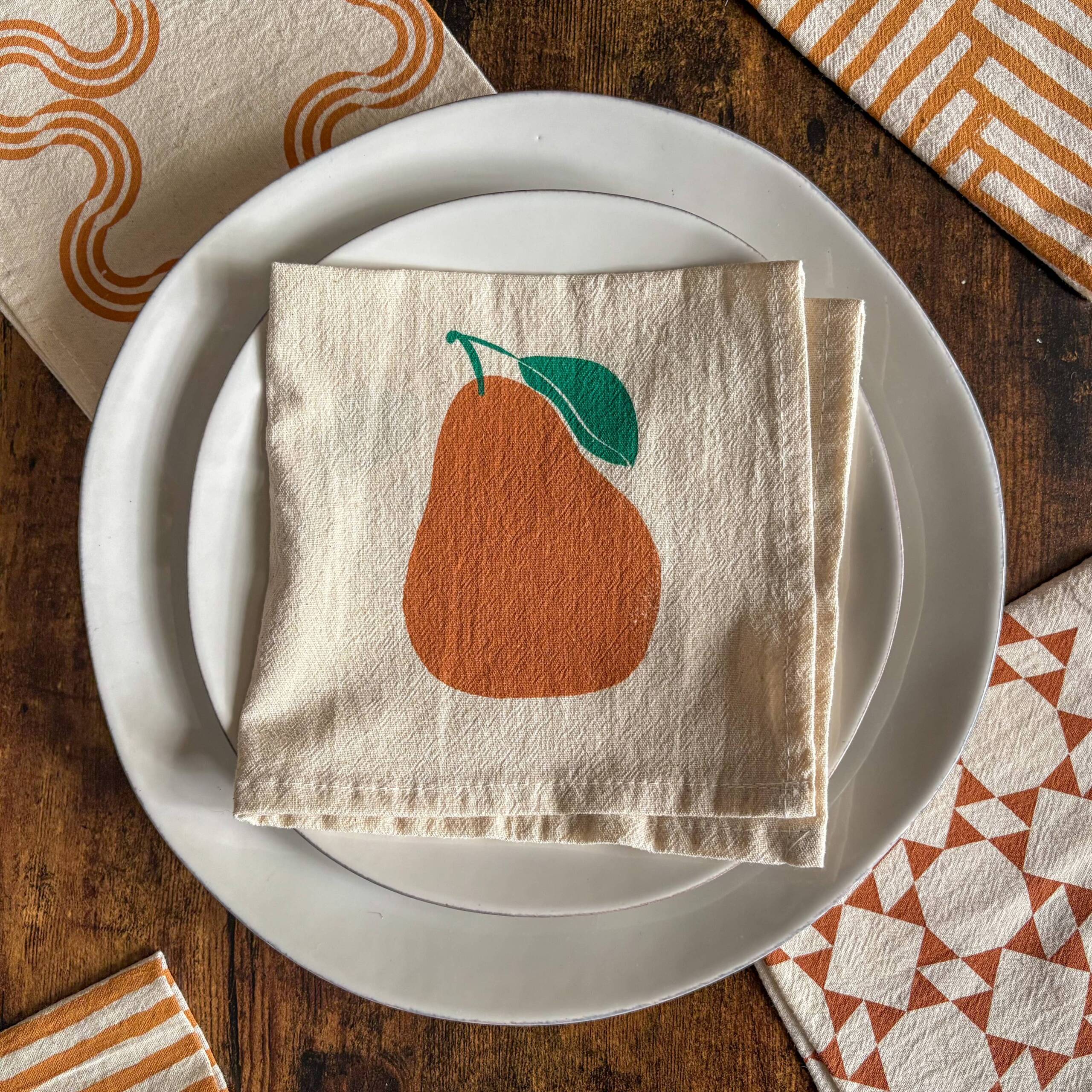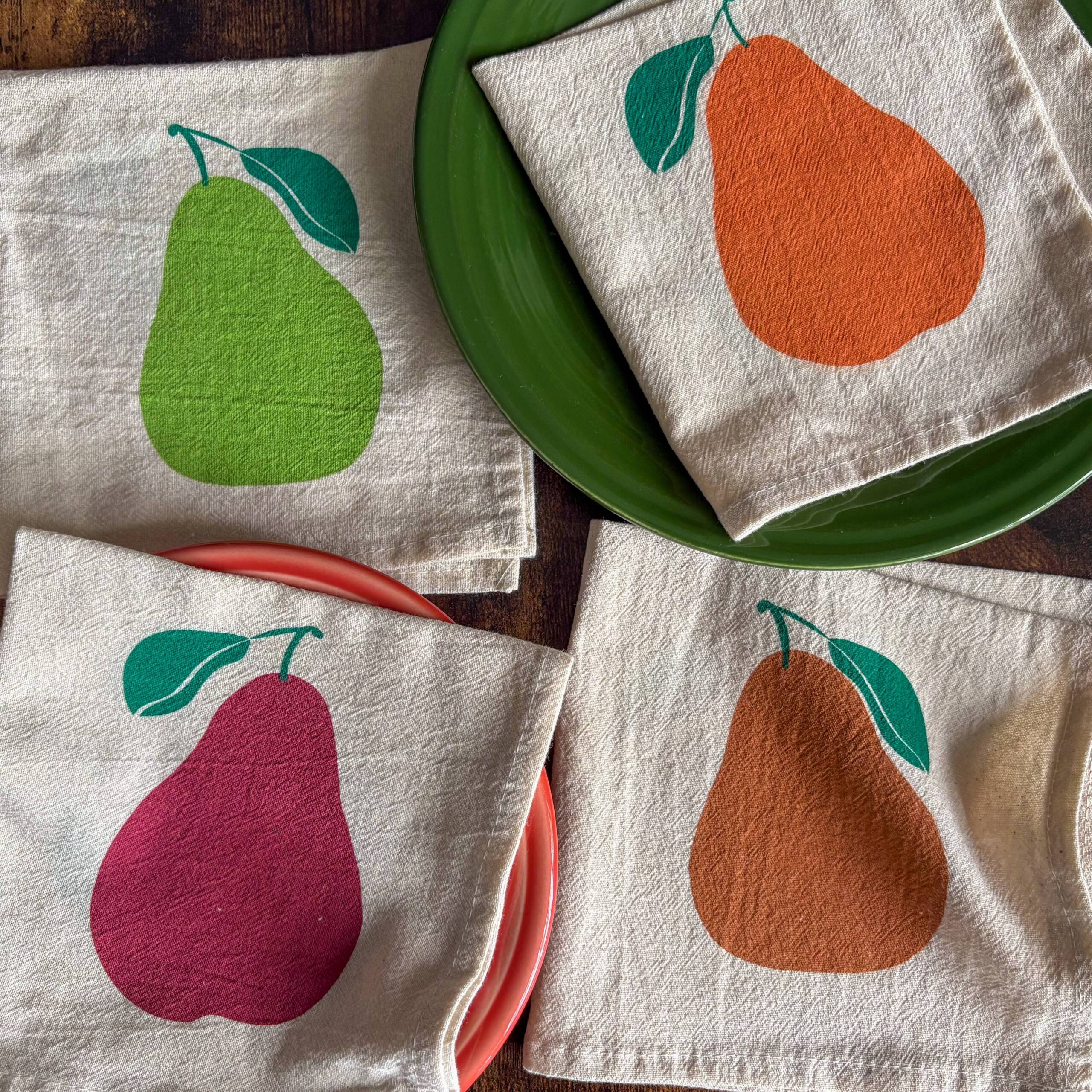 The simple pear pattern brings a warm and welcoming touch to the table. Printed by hand in small editions. Made in New York.