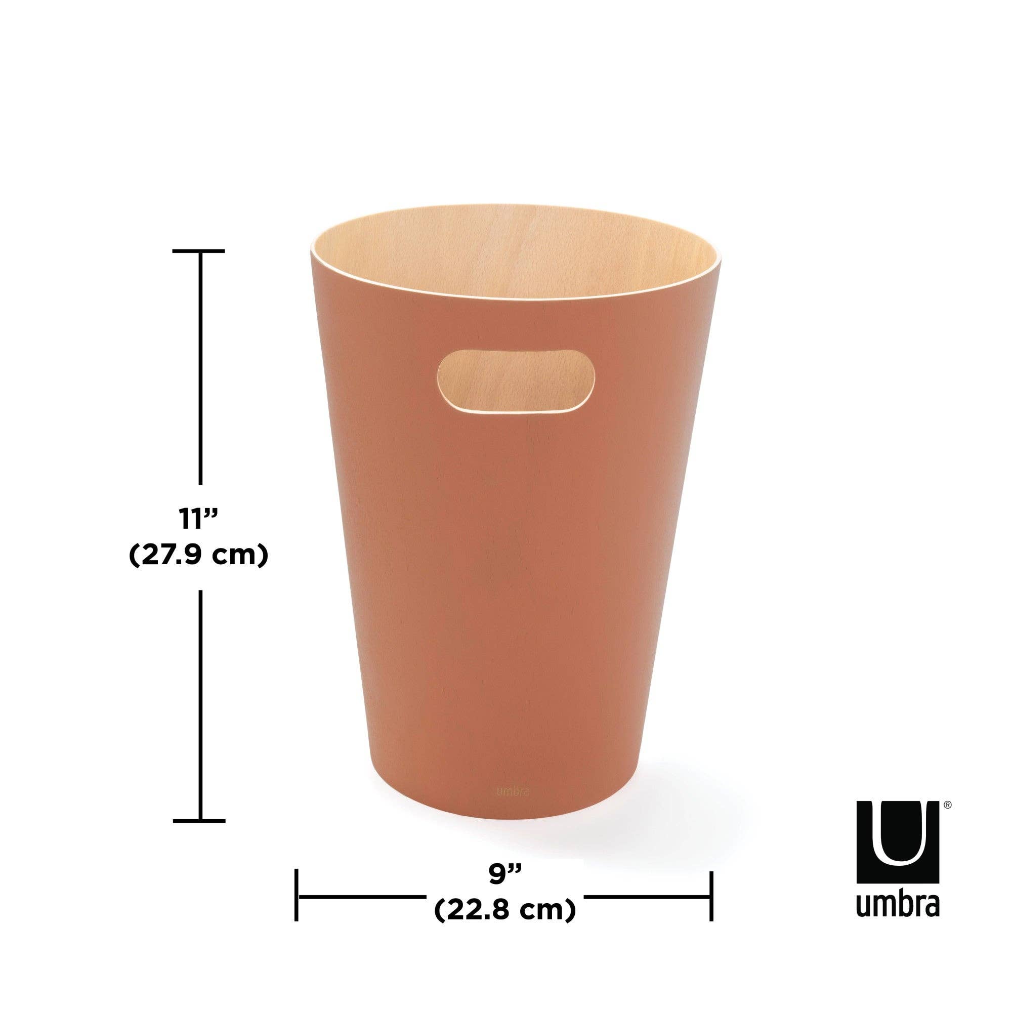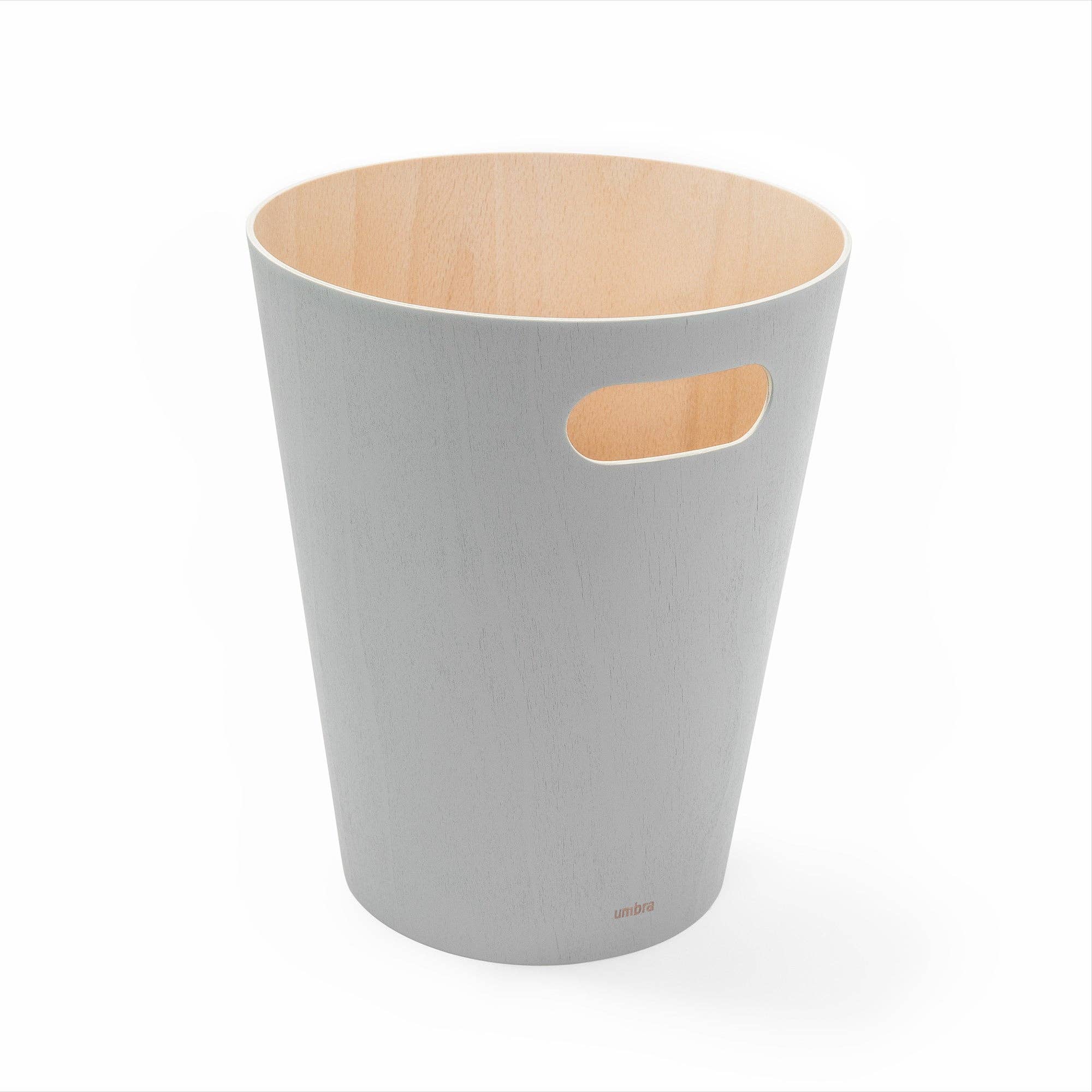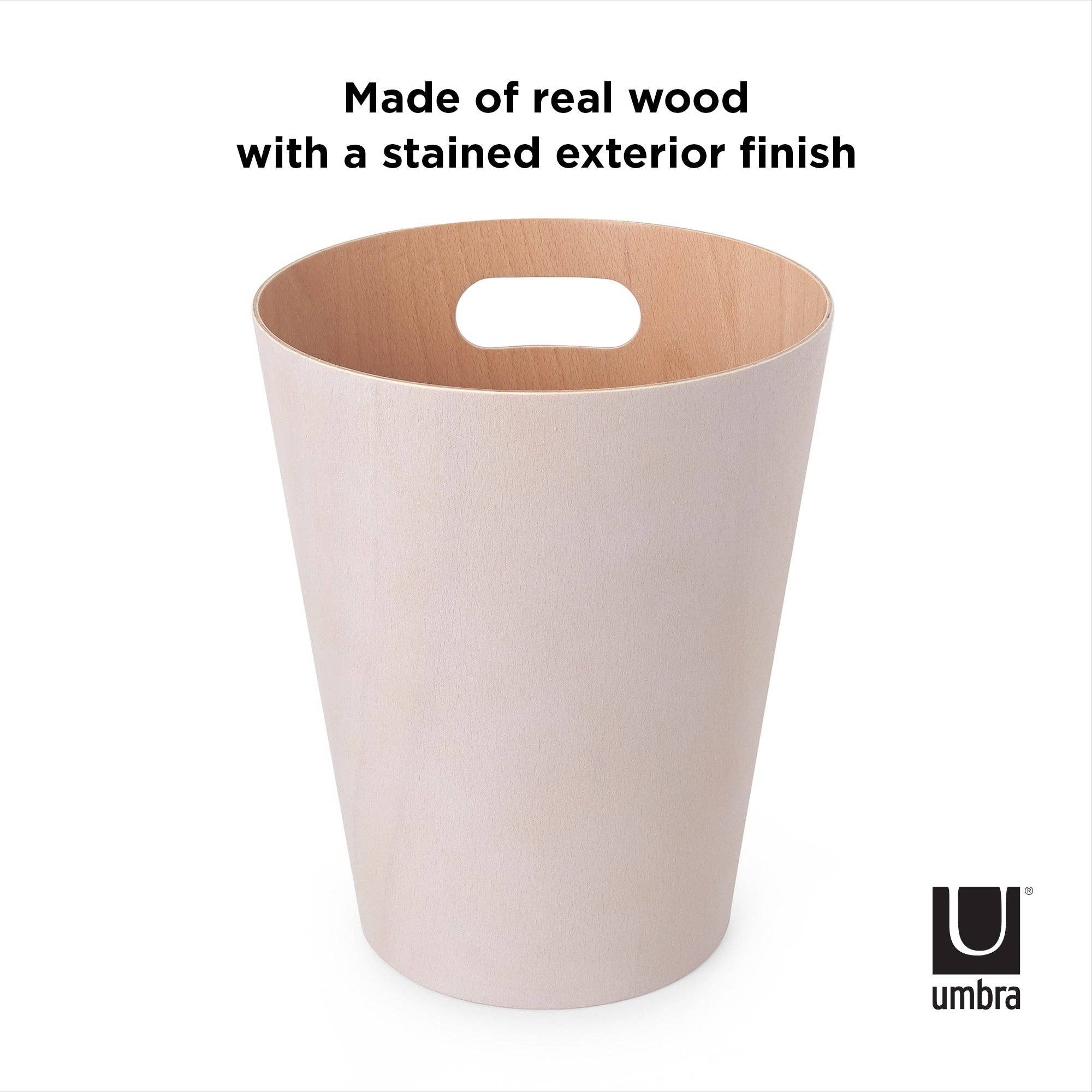 Umbra Woodrow Trash Can 2-Gallon (7.5 L) CapacityWoodrow is a contemporary waste can that adds a modern touch to any space. The two-tone can combines a natural wood interior with a stained finish on the outer surface, which helps to warm and ground a room. Featuring conveniently integrated handles, Woodrow is freely moveable and disposing of waste and recycling is hassle-free. The beautifully curved wooden can is perfect for any powder room, bathroom, office, or study, and transforms a basic household product into an eye-catching piece of decor. Measuring 9” in diameter and 11” tall with a capacity of 2 gallons (7.5 L), Woodrow trash can is great for small spaces.