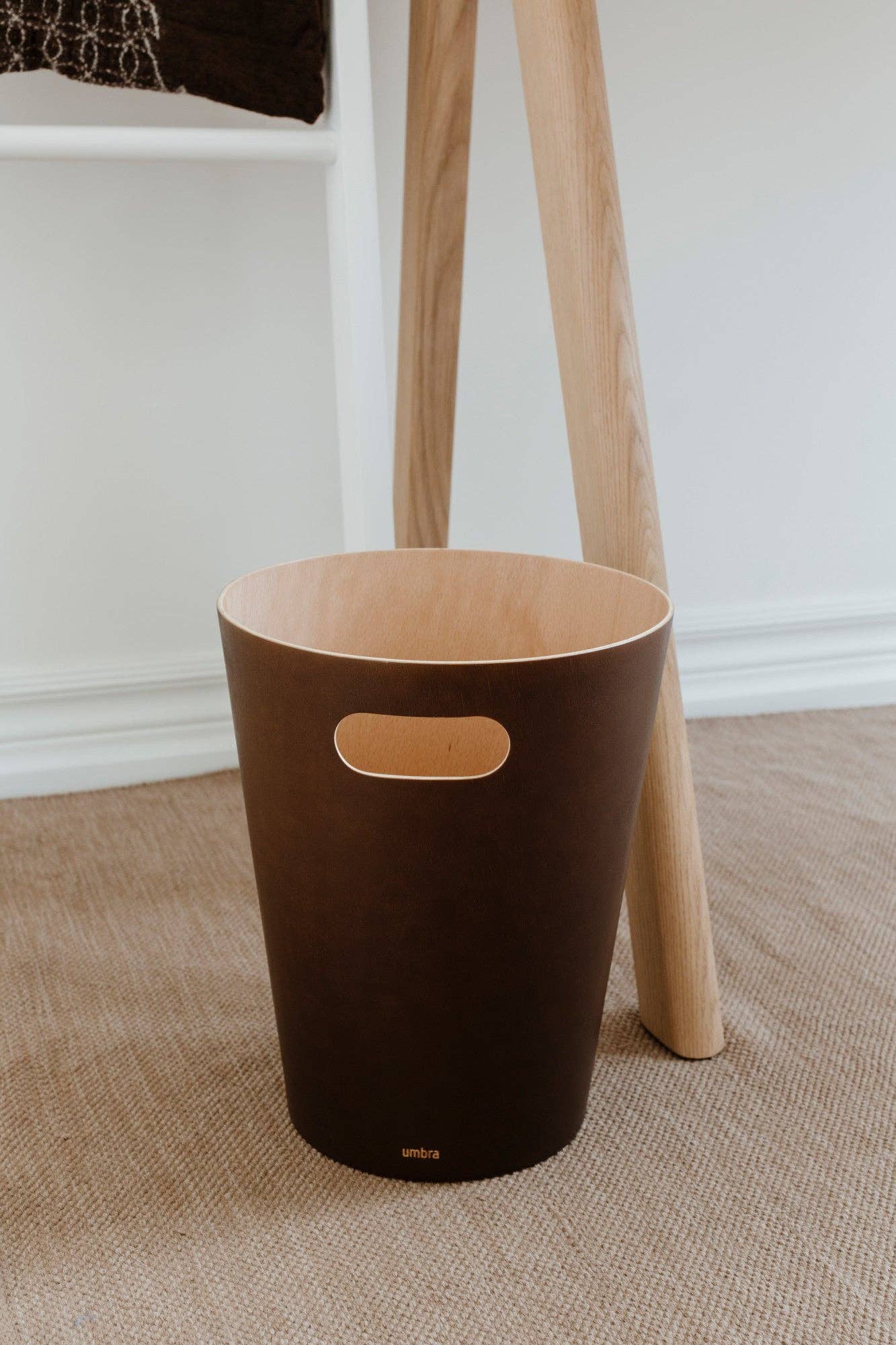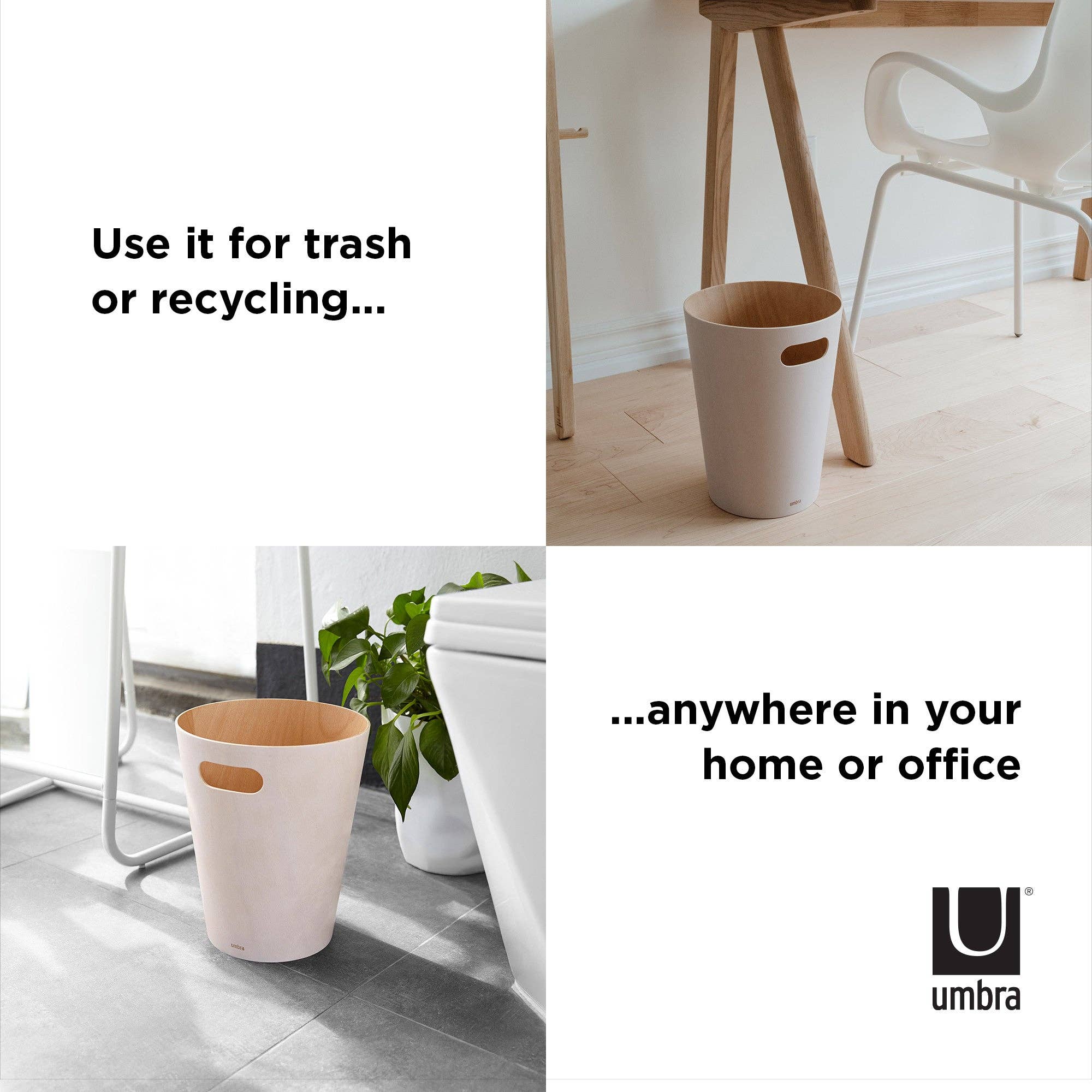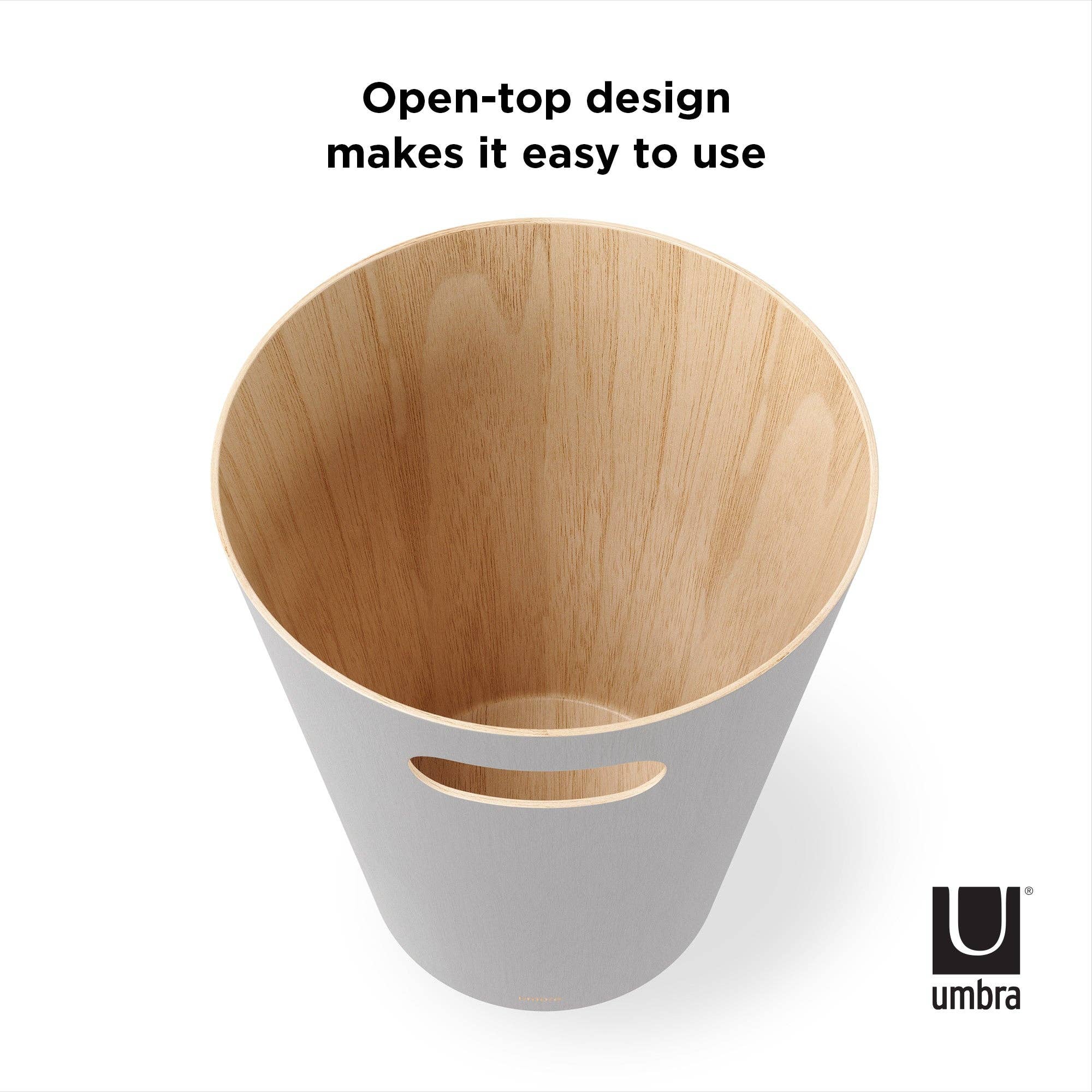 Umbra Woodrow Trash Can 2-Gallon (7.5 L) CapacityWoodrow is a contemporary waste can that adds a modern touch to any space. The two-tone can combines a natural wood interior with a stained finish on the outer surface, which helps to warm and ground a room. Featuring conveniently integrated handles, Woodrow is freely moveable and disposing of waste and recycling is hassle-free. The beautifully curved wooden can is perfect for any powder room, bathroom, office, or study, and transforms a basic household product into an eye-catching piece of decor. Measuring 9” in diameter and 11” tall with a capacity of 2 gallons (7.5 L), Woodrow trash can is great for small spaces.