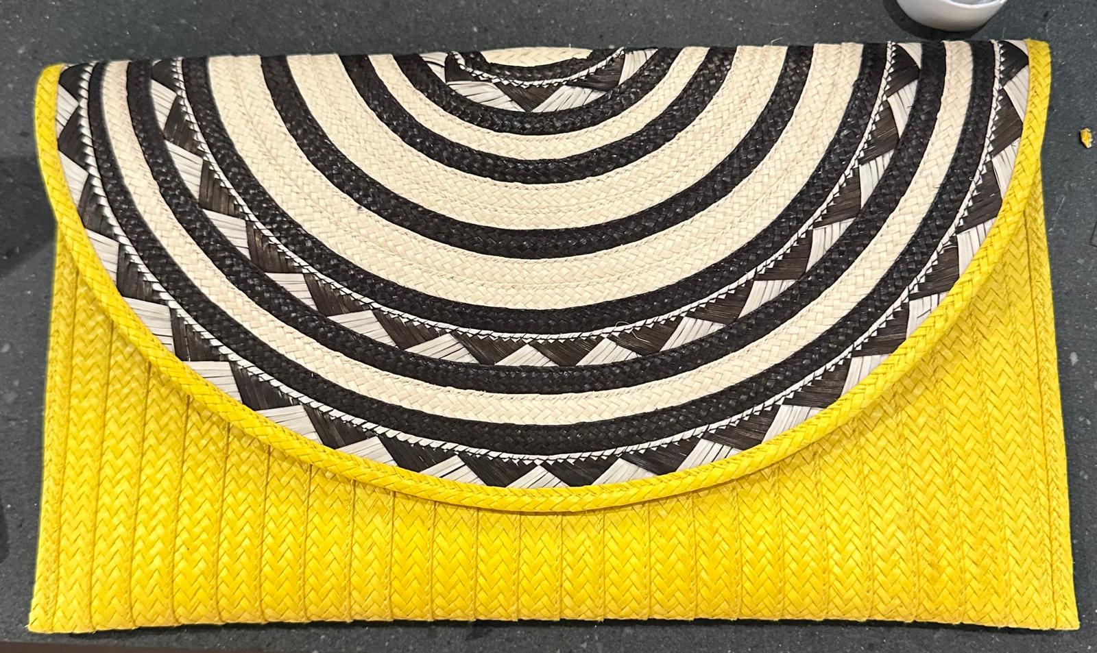 The clutch-style bags are often called mochilas in Colombia and are a cultural symbol for the country, with different designs and materials representing various indigenous communities.
